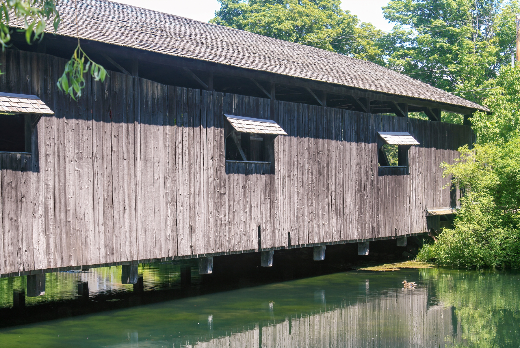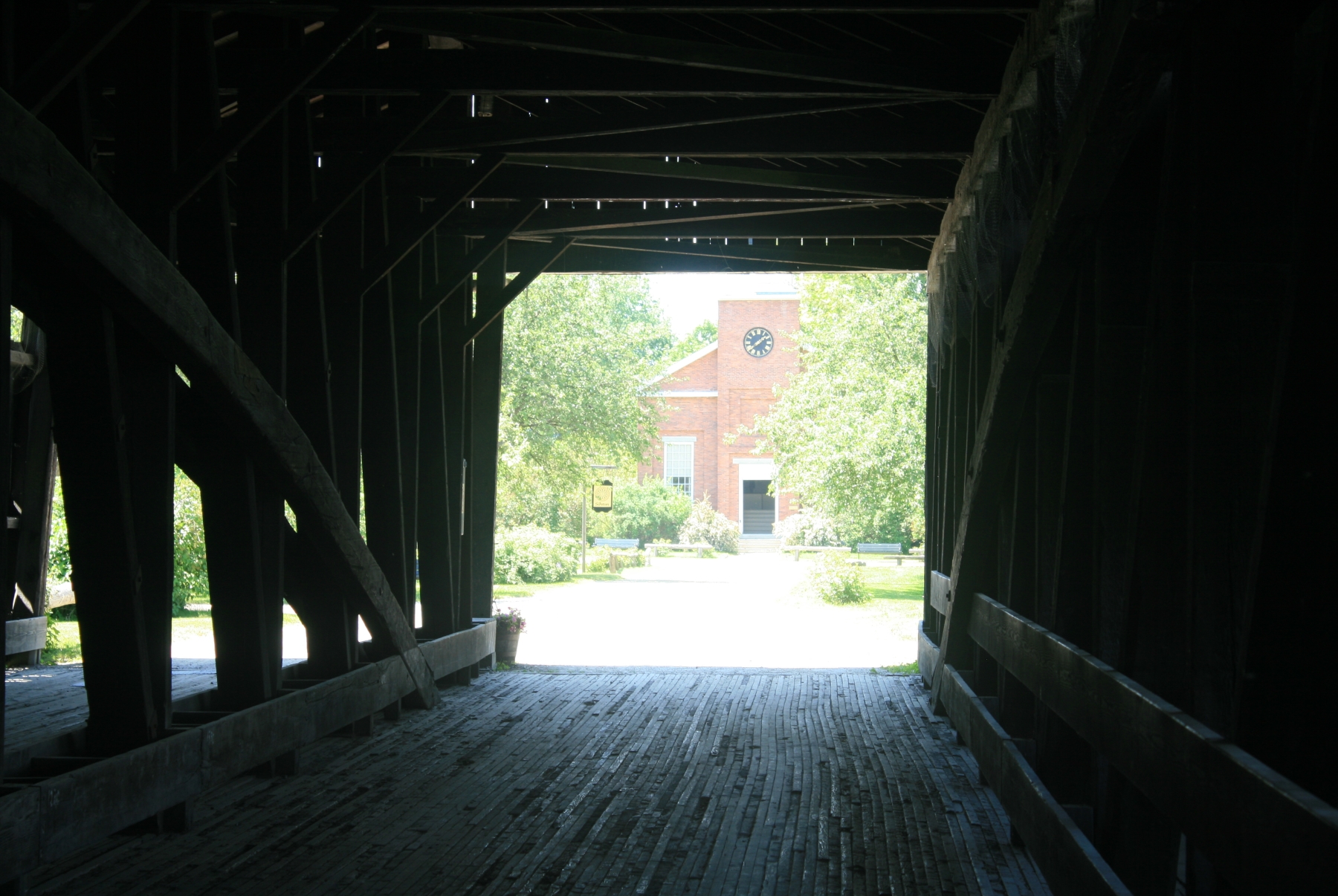 Built in 1845, the Museum Covered Bridge originally spanned the Lamoille River in Cambridge, Vermont. The trusses for the double bridge were assembled in a field next to the chosen site. Measuring 168 feet (51 m) in length, with two vehicle lanes and a footpath (attached after its original construction), it is an impressive example of the engineering principles and bridge-builder's craft practiced during the 19th century. The bridge was lighted by kerosene lamps.