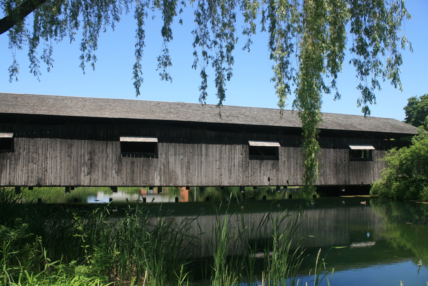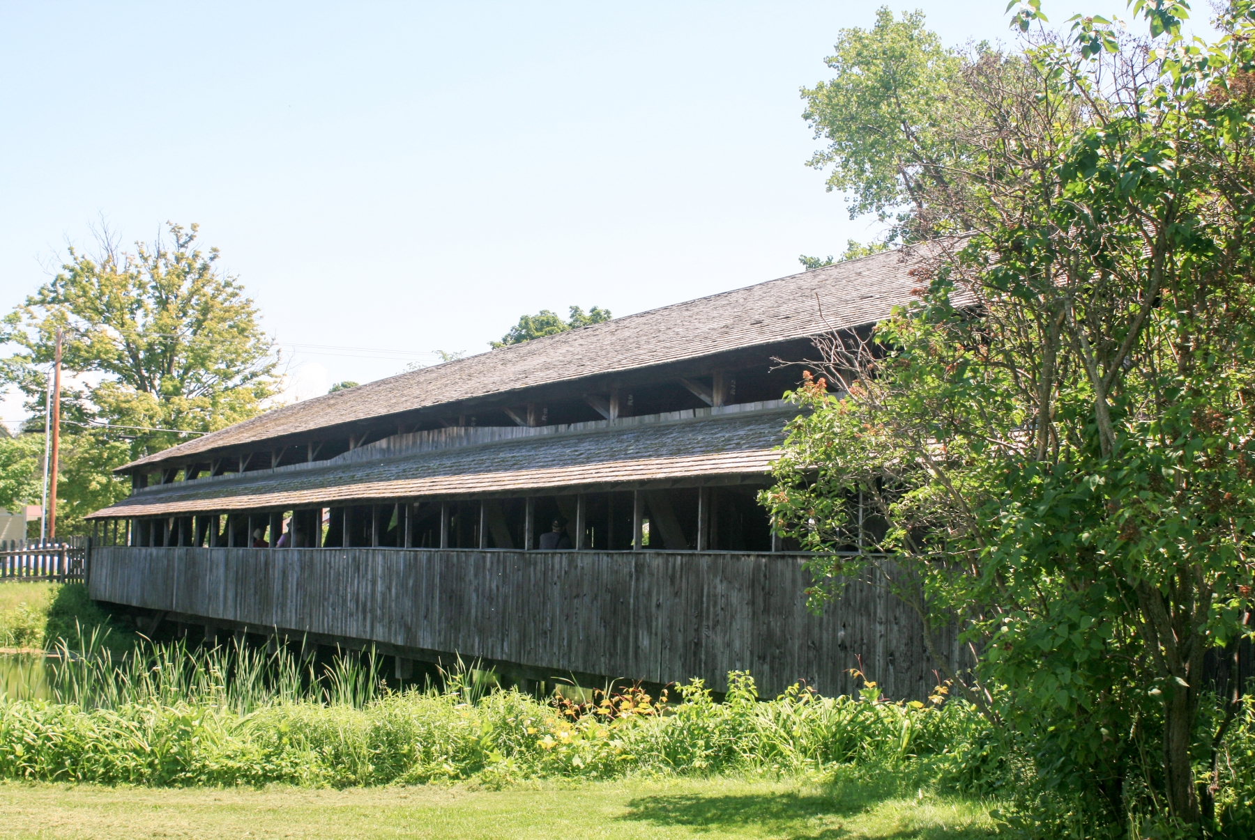 The museum dismantled the Covered Bridge in 1949 and moved it to the museum grounds. The beams still bear the identifying numbers for reconstruction. By situating it above a man-made pond, extensive landscaping integrated the bridge into the grounds. The Covered Bridge served for many years as the museum's entrance, but when automobile traffic proved too taxing, the museum relocated the entrance and retired the bridge from duty.
