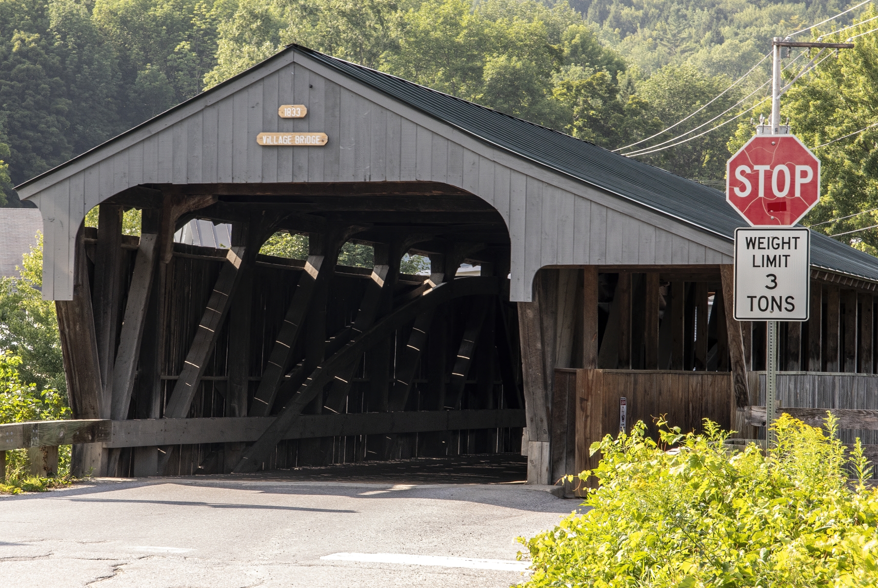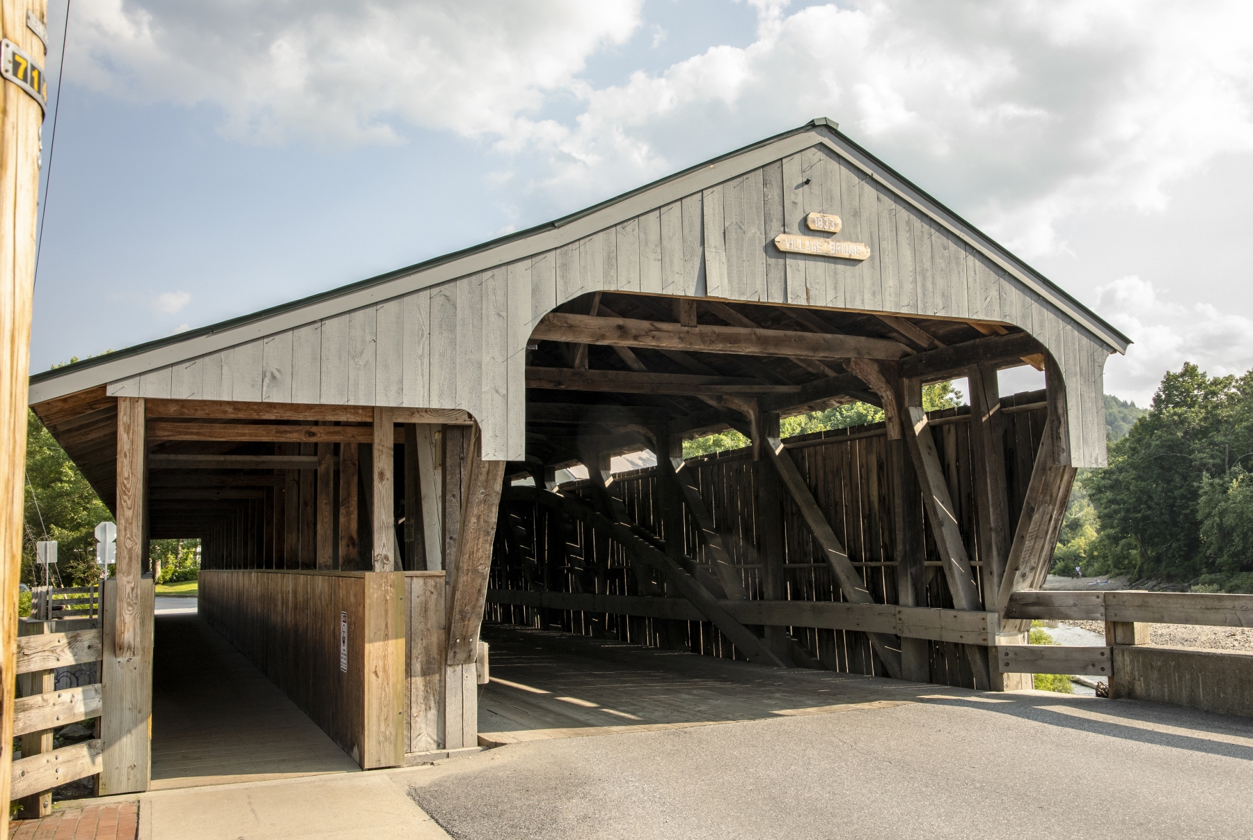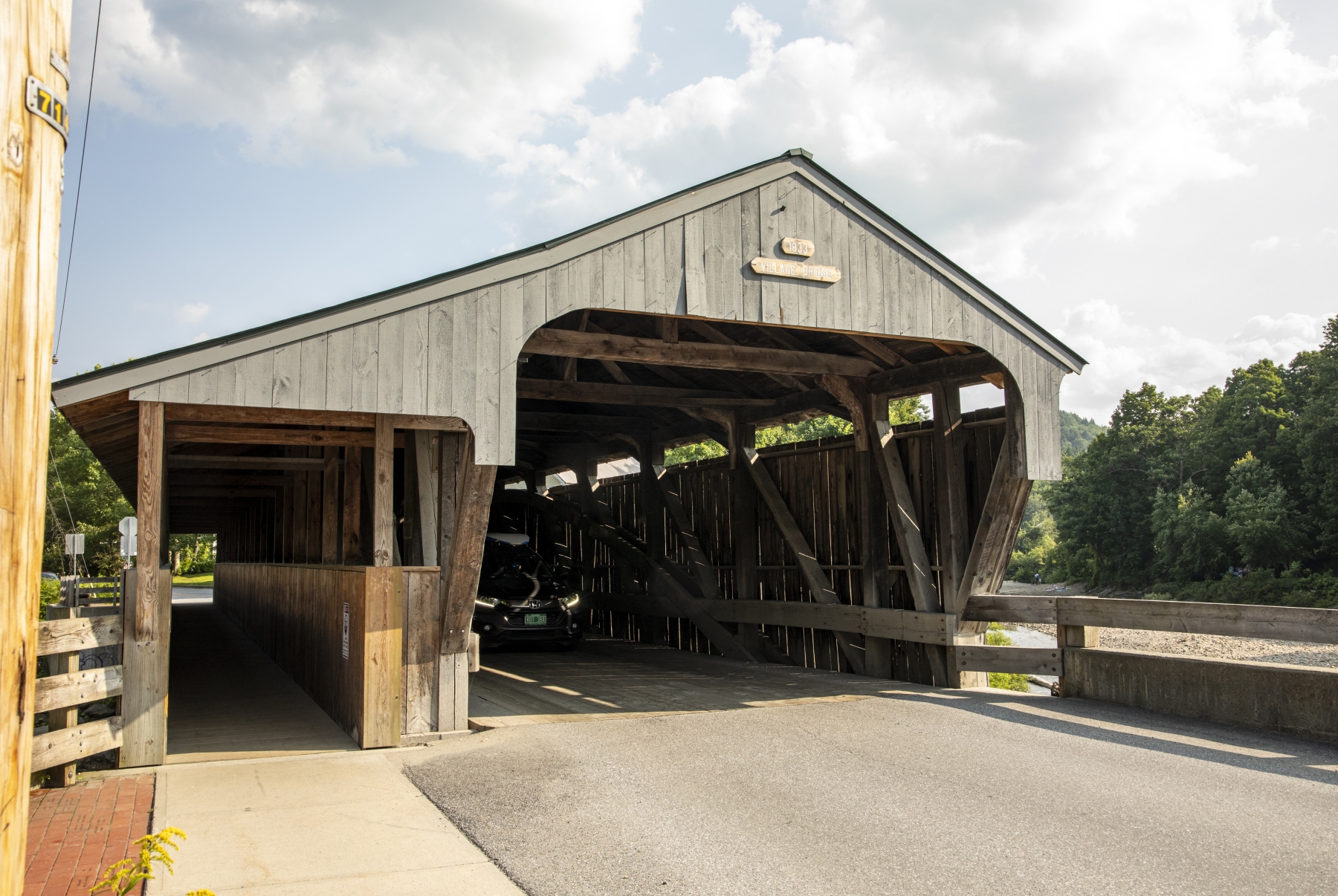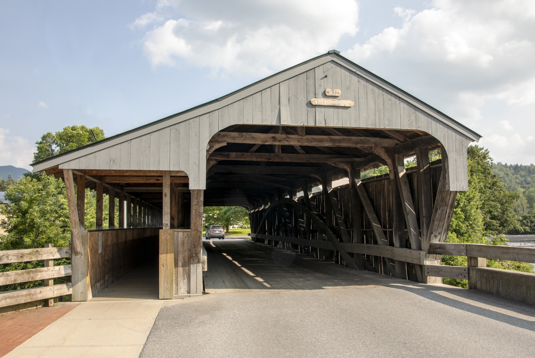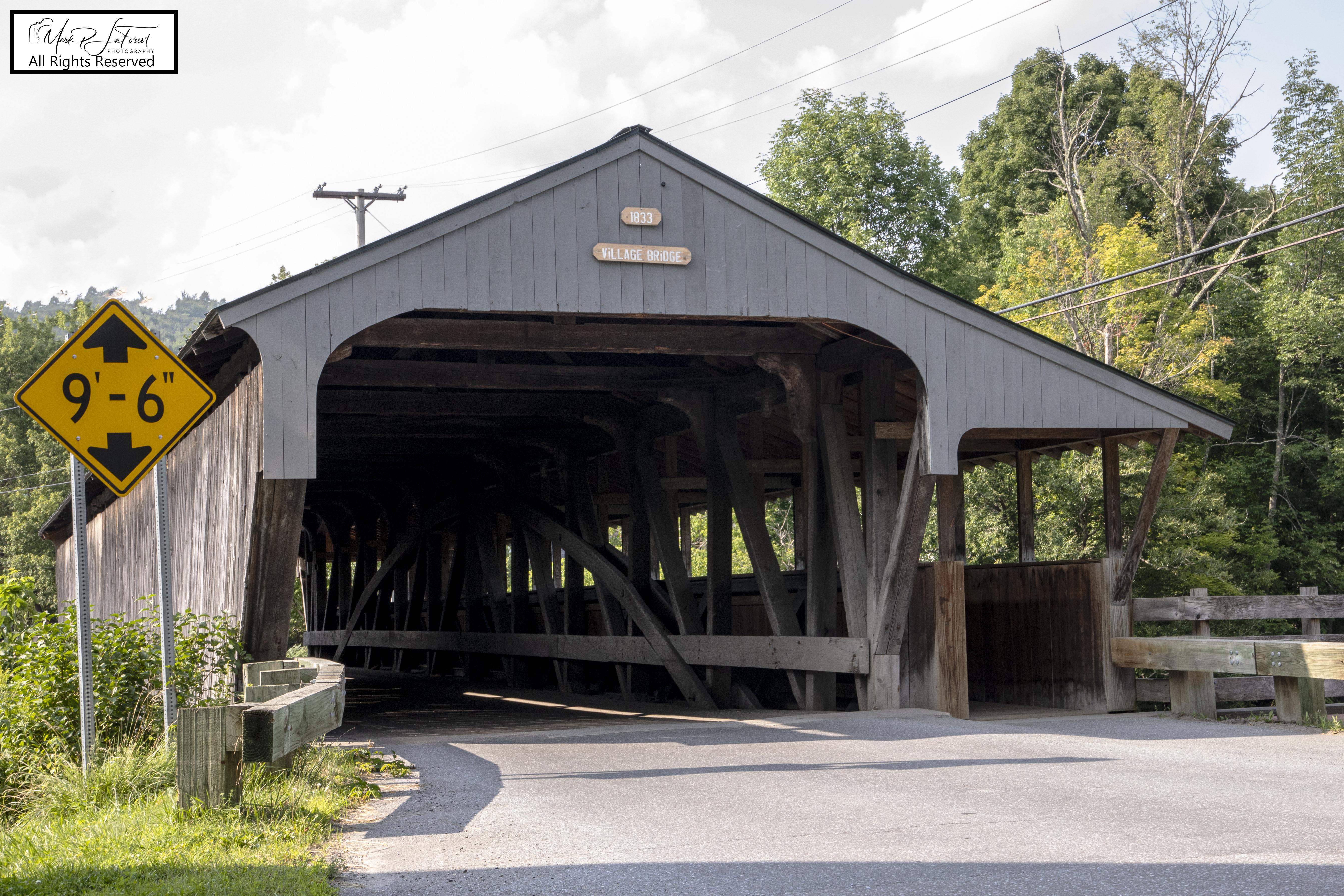 The Great Eddy Covered Bridge stands just east of Waitsfield's center, spanning the Mad River in a roughly north-south orientation. It is a single-span Burr truss structure, 105 feet (32 m) in length. Each truss incorporates a laminated arch, and laminated stringers have been added underneath the deck for added strength. The bridge is covered by a metal roof, which extends on the east side over a walkway on the outside of the eastern truss. The bridge was built in 1833 and is at least the second-oldest covered bridge (after only the Pulp Mill Covered Bridge, which may have been built at a later date). It is also the state's longest single-span Burr truss bridge. -- Source Wikipedia