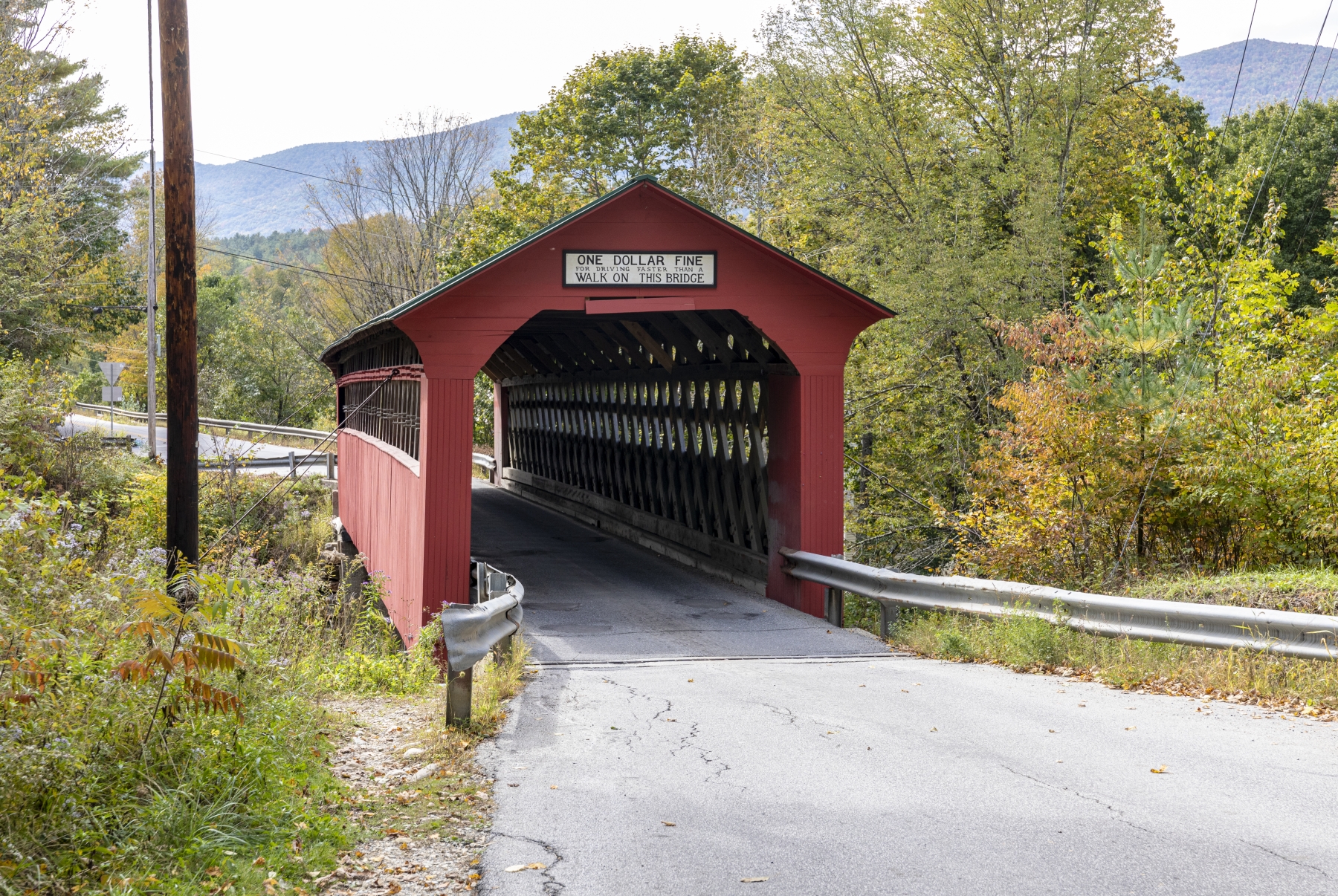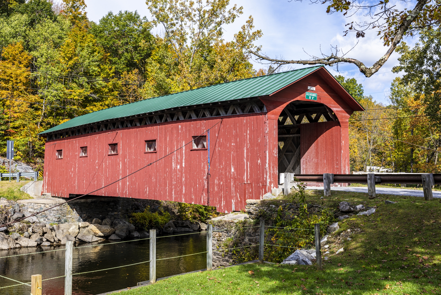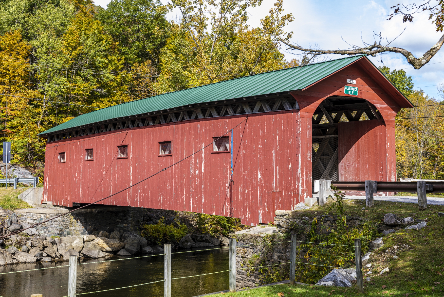 The Arlington Green Covered Bridge is located at the village of West Arlington, crossing Batten Kill just south of Route 313. It is a single span structure, with a length of 80 feet (24 m), a total width of 17.5 feet (5.3 m), and a roadway width of 14 feet (4.3 m) (one lane). It rests on mortared stone abutments, of which the northern one has since been faced in concrete. Guying cables are fastened near each of its corners. The sides are finished in vertical board siding, and the roof is metal. There are five small square openings in each of the sides.